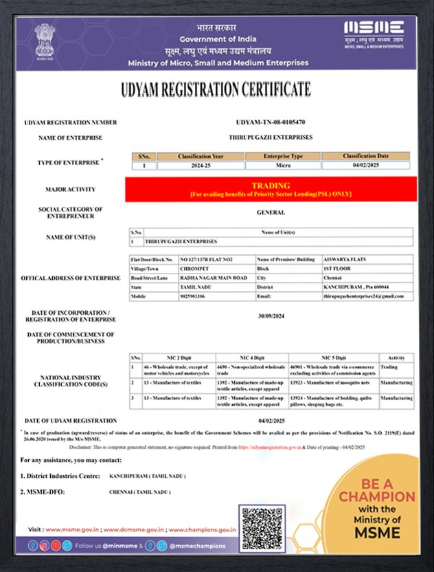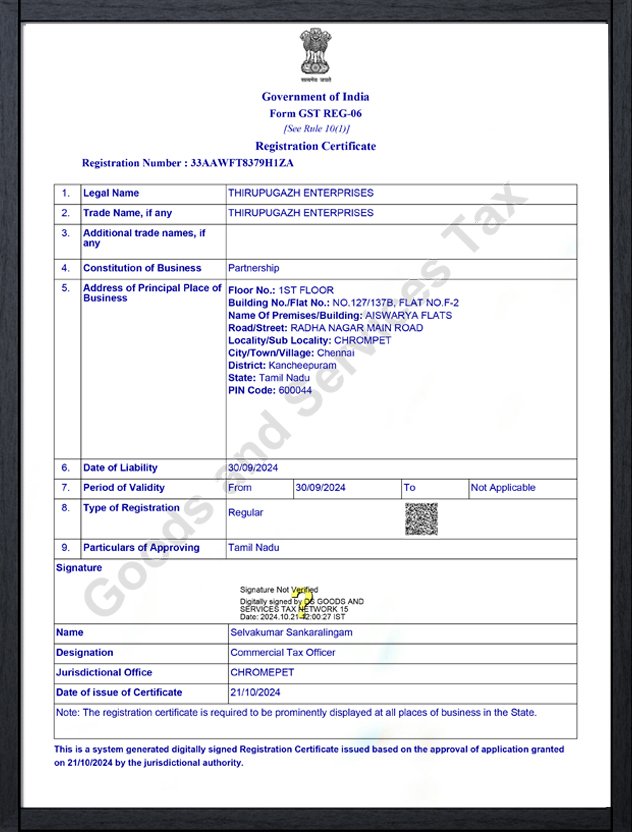 THIRUPUGAZH ENTERPRISES is a dynamic and customer-focused enterprise based in Chennai, Tamil Nadu. Established in 2024, we specialize in delivering high-quality products and services tailored to meet the diverse needs of our clients across various sectors.